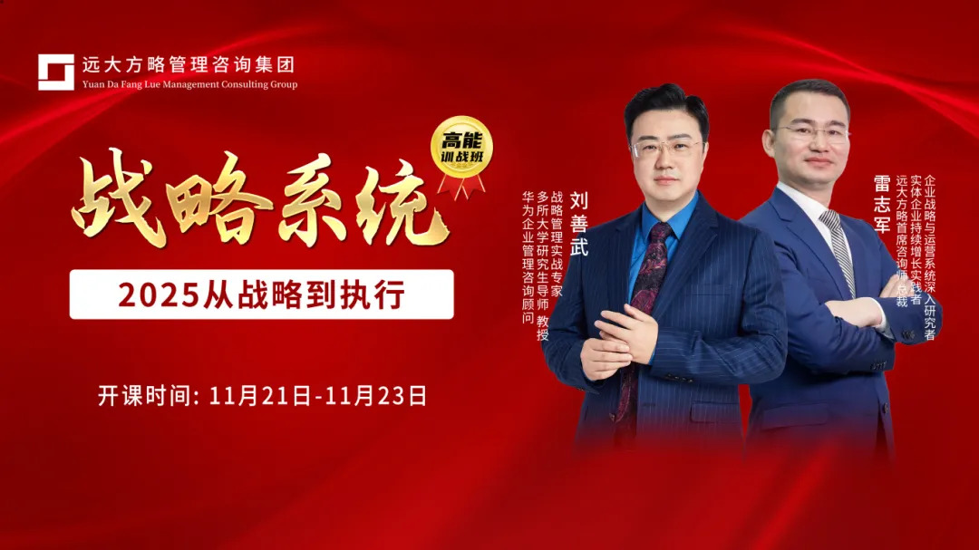 為幫助企業(yè)贏戰(zhàn)2025,10月24日-26日,遠(yuǎn)大方略特邀華為企業(yè)管理咨詢顧問劉善武老師,為大家?guī)砹藶槠谌斓摹?strong>戰(zhàn)略系統(tǒng)-2025從戰(zhàn)略到執(zhí)行》課程,重新理解和審視戰(zhàn)略,幫助更多企業(yè)保持方向大致正確,高效落地執(zhí)行,跑上極速增長快車道。