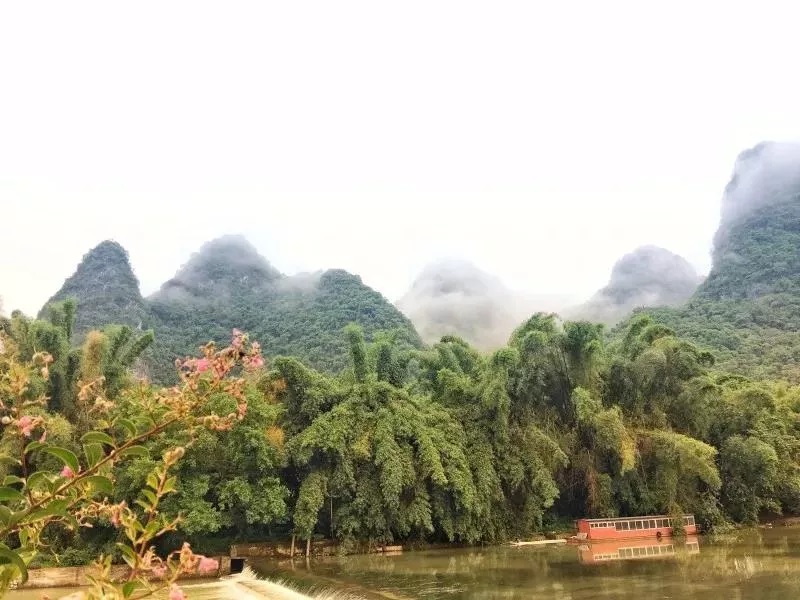 7:40AM興坪古鎮的美景,一座座山與山間環繞的霧氣朦朦朧朧的詩意畫境是桂林的特色。