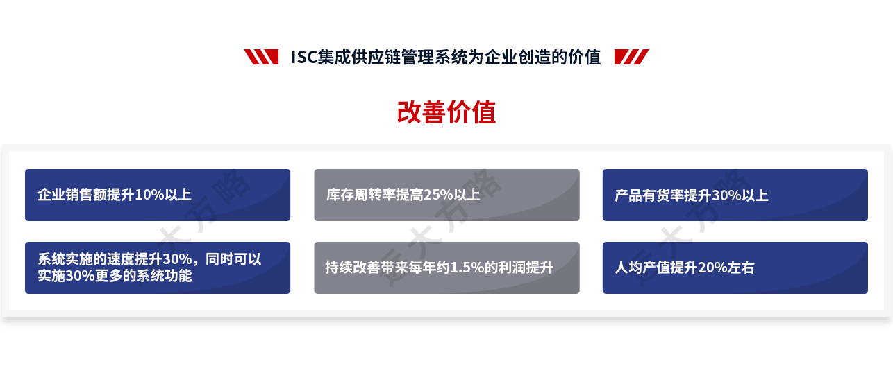 3、數(shù)據(jù)增長:打造高效供應鏈咨詢項目,通過提高交付的可靠性與靈活性,提升客戶的滿意度;通過降低庫存、減少生產(chǎn)及分銷的費用,降低公司成本;通過流程優(yōu)化、消弭異常事件,提升企業(yè)整理的流程品質。實現(xiàn):人均產(chǎn)值提升22%,訂單交付及時率提升33%,供應鏈周期縮短21%,庫存周轉速率提升23%,供應鏈響應速度提升32%。